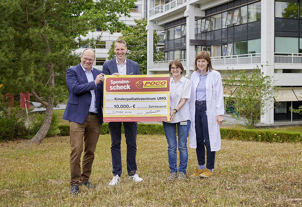 „Wenn Kinder unheilbar krank sind, wirkt sich dies auf die ganze Familie aus. Krankheit, Pflege, Arbeit und Alltag unter einen Hut zu bringen, kann dann sehr schwierig sein. Unsere Spende ist daher in der Kinderpalliativmedizin besonders gut aufgehoben“, sagte bei der Spendenübergabe Stephan Sielhorst, Personalleiter und Mitglied der Geschäftsleitung der POCO Einrichtungsmärkte GmbH. Sielhorst überreichte mit seinem Geschäftsleitungs-Kollegen und Leiter der Organisation Sebastian Schrader eine Spendensumme von 10.000 Euro für die Arbeit der Kinderpalliativmedizin der UMG an Prof. Dr. Jutta Gärtner, Direktorin der Klinik für Kinder- und Jugendmedizin, und Elisabeth Böning, Palliativfachkraft des Kinderpalliativteams.